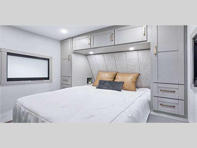 Sleeps 4 Slides 2 Length 34 ft 11 in Ext Width 8 ft Ext Height 11 ft 9 in Int Height 7 ft Hitch Weight 924 lbs GVWR 13495 lbs Dry Weight 10297 lbs Fresh Water Capacity 62 gals Grey Water Capacity 75 gals Black Water Capacity 45 gals Tire Size 16" Available Beds Queen Refrigerator Type 12V Refrigerator Size 16 cu ft Cooktop Burners 3 Shower Size 30" x 42" Number of Awnings 2 Axle Weight 7000 lbs LP Tank Capacity 60 lbs Water Heater Type Tankless On Demand AC BTU 36000 btu TV Info LR 42" Smart Televator TV, BR 32" Smart TV Awning Info 10' 6" and 12' Axle Count 2 Washer/Dryer Available Yes Number of LP Tanks 2 Shower Type Shower w/Seat Solar Wattage 370 watts Similar Floorplans