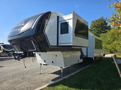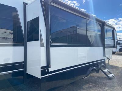 Sleeps 4 Slides 3 Length 34 ft 11 in Ext Width 8 ft Ext Height 13 ft 3 in Hitch Weight 2298 lbs GVWR 15495 lbs Dry Weight 12276 lbs Fresh Water Capacity 75 gals Grey Water Capacity 90 gals Black Water Capacity 45 gals Tire Size 215/75 R17.5 Furnace BTU 35000 btu Available Beds King Refrigerator Type 12V Refrigerator Size 16 cu ft Cooktop Burners 3 Shower Size 30" x 42" Number of Awnings 2 Axle Weight 7000 lbs LP Tank Capacity 30 lbs Water Heater Type Tankless On Demand AC BTU 31500 btu TV Info LR 50" Smart Telescoping TV, BR 32" Smart TV Awning Info 11' & 15' Electric w/Neon COB/Dotless LED Lighting Axle Count 2 Washer/Dryer Available Yes Number of LP Tanks 2 Shower Type Standard Similar Fifth Wheel Floorplans