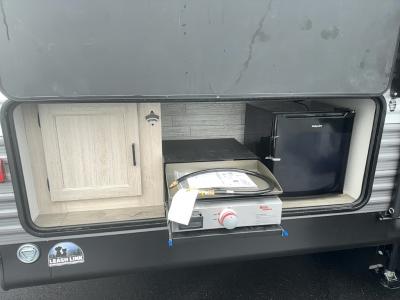 When you enjoy camping with your own accommodations and space for the whole crew, hitch this trailer up and head to the campgrounds! After loading everything easily thanks to the dual entry doors and all the interior and exterior storage, you will have no worries that you left anything behind. The electric awning is easy to set up, and the awning offers multicolor LED lights to choose from by using the remote. When you are outside the cook might like to make a meal using the outside camper kitchen. The interior kitchen offers full amenities including a pantry, and everyone can enjoy the angled entertainment center. There are double-size bunks with a ladder for the kids and a walk-around RV queen bed for the owner to sleep on, plus furniture in the living area that doubles as additional sleeping space!