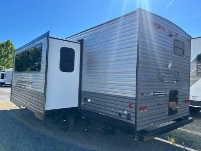 This is the perfect mid-size travel trailer for you and your family! The 46" x 74" double-size bunk beds with lower interior storage offer a comfortable sleeping space for the kids and you will have your own private sleeping space with the 60" x 74" queen bed in the front bedroom. Freshen up each morning in the rear corner bathroom with the tub/shower and a mirror to get ready each morning. You can prepare your best home cooked meals with the GE stainless three burner cooktop and GE stainless 10.7 cu. ft. 12V refrigerator, then enjoy them together at the booth dinette. The sofa is near the entertainment center for a relaxing movie night. Don't leave any of your outdoor gear behind either, thanks to the front pass-through storage area and the exterior outside storage area. You could even add the optional outside camper kitchen to grill the catch of the day on the pull out griddle!