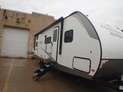 Camping trips are made complete in this spacious travel trailer! You can wake up feeling refreshed each morning in the front private bedroom that includes a queen bed and underbed storage, and there is a full bath towards the back to get ready for your day. The double-size bunks are sure to be a hit with the little ones or your guests, and the large pantry beside the bunks include washer/dryer hookups if you want to add these appliances. An L-shaped counter in the kitchen will provide more space as you prep breakfast on the two burner cooktop, and there is a 12V refrigerator to keep the eggs and milk cold. Your crew can dine at the booth dinette, relax on the sofa with a theater seating option, or take your plates outdoors under the 20' power awning!