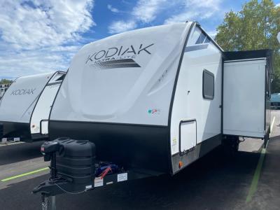 Each Kodiak travel trailer by Dutchmen includes a diamond front plate, easy lube axles, and a power tongue jack for hassle-free towing. The bear cave storage will allow you to bring along all the camp gear, and the power awning with an LED light will create an inviting outdoor space. Head inside to enjoy the designer valances, blackout roller shades, and seamless countertops. There is also HyperDeck flooring that will withstand your many adventures plus a 6' 8" interior height for more head room. A high output furnace and 13.5k BTU A/C will keep you comfortable, and the on-demand tankless water heater will provide instant hot water when you need it!