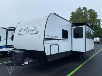 Each Kodiak travel trailer by Dutchmen includes a diamond front plate, easy lube axles, and a power tongue jack for hassle-free towing. The bear cave storage will allow you to bring along all the camp gear, and the power awning with an LED light will create an inviting outdoor space. Head inside to enjoy the designer valances, blackout roller shades, and seamless countertops. There is also HyperDeck flooring that will withstand your many adventures plus a 6' 8" interior height for more head room. A high output furnace and 13.5k BTU A/C will keep you comfortable, and the on-demand tankless water heater will provide instant hot water when you need it!