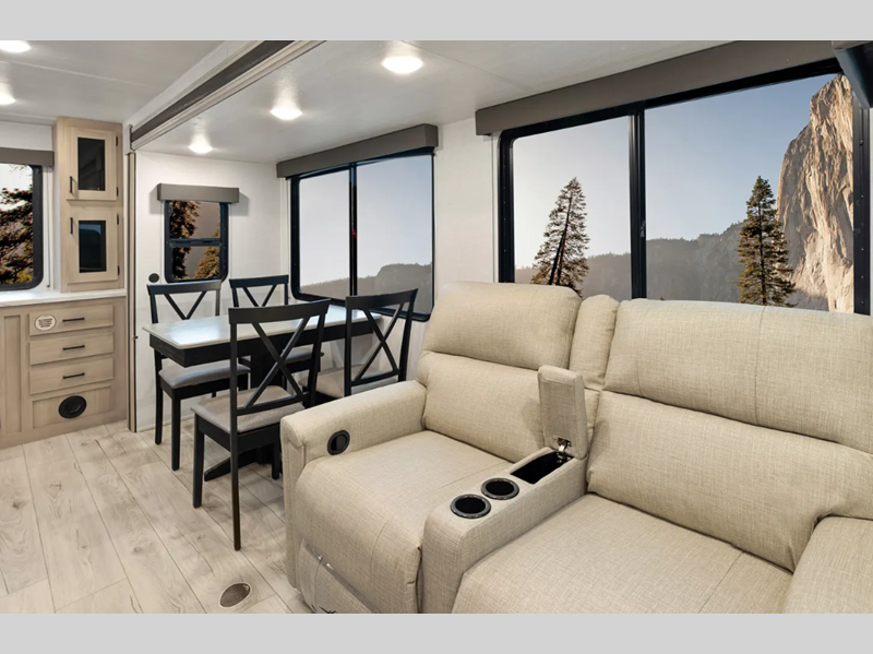 Sleeps 4 Slides 2 Length 34 ft Ext Width 8 ft Ext Height 11 ft 3 in Int Height 6 ft 9 in Hitch Weight 835 lbs Dry Weight 7963 lbs Cargo Capacity 1672 lbs Fresh Water Capacity 40 gals Grey Water Capacity 60 gals Black Water Capacity 30 gals Furnace BTU 35000 btu Available Beds King Refrigerator Type 12V Refrigerator Size 10.7 cu ft Cooktop Burners 3 Shower Size 30" x 36" Number of Awnings 1 Water Heater Type Tankless AC BTU 15000 btu Awning Info Electric with LED Lights Axle Count 2 Shower Type Standard Electrical Service 50 amp Similar Floorplans