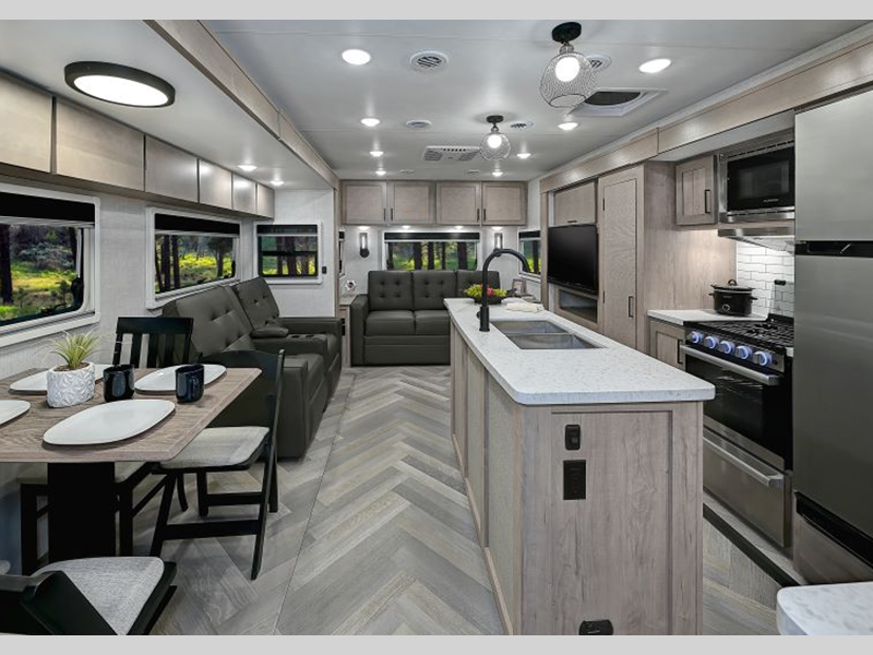 Sleeps 4 Slides 2 Length 35 ft 10 in Ext Width 8 ft Ext Height 11 ft 8 in Hitch Weight 1050 lbs GVWR 9495 lbs Dry Weight 8190 lbs Cargo Capacity 1305 lbs Fresh Water Capacity 55 gals Grey Water Capacity 70 gals Black Water Capacity 35 gals Tire Size 16" Furnace BTU 30000 btu Available Beds Queen Refrigerator Type 12V Refrigerator Size 10 cu ft Convection Cooking Yes Cooktop Burners 3 Shower Size 30" x 36" Number of Awnings 2 LP Tank Capacity 20 lbs Water Heater Capacity 6 gal Water Heater Type Quick Recovery AC BTU 15000 btu TV Info LR 12V LED HDTV Awning Info 9' and 11' Electric w/ Dimmable Light Axle Count 1 Washer/Dryer Available Yes Number of LP Tanks 2 Shower Type Standard Electrical Service 50 amp Similar Floorplans
