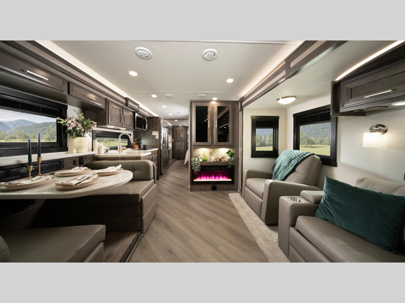 Each is built on a Ford F53 chassis with a 7.3L V-8 335 HP engine, and includes front and rear disc, 4-wheel anti-lock brakes, and a 5,000 lb. rear hitch receiver with dual connector and 7-pin plug to be able to tow your commuter vehicle or toys. The cockpit offers a Sony infotainment center with Apple CarPlay and Android Auto, backup and side-view cameras for safety when on the road and parking, and 6-way power and swivel driver/passenger seats to be able to enjoy the seating while driving or stopped. The interior offers luxurious amenities such as an electric fireplace, LED-lit solid surface kitchen countertops, a residential refrigerator, and a shower with decorative surround, glass door, skylight and light.