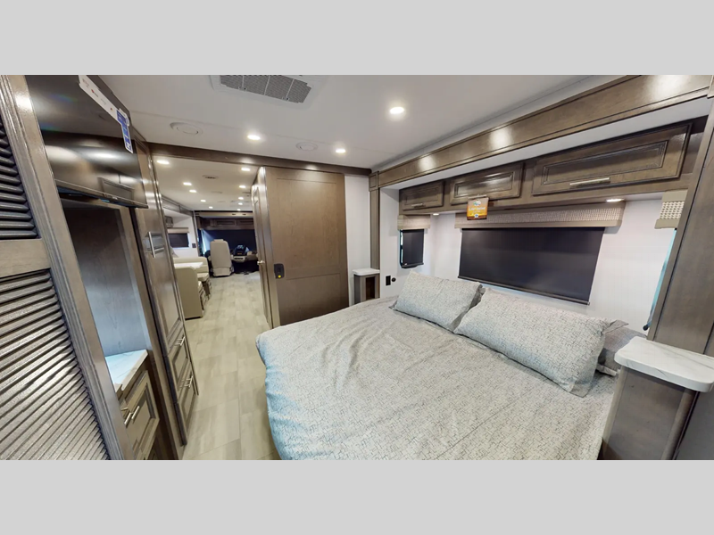 A MORryde 1.5 steel truss chassis up-fit holds them together and a hydraulic 4-point leveling system keeps them level wherever you go. If you desire to go off the grid, then you will appreciate the solar panel and 6,000-watt Yamaha generator. With a Sony 10" in-dash touchscreen radio you can play your favorite tunes, and the color side and rear cameras will make parking at the campsite easier than ever. There are also raised panel solid wood cabinet doors, spacious galleys, and plenty of storage space throughout for your belongings.