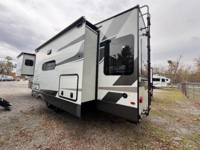 Outside, you'll find a power awning with an adjustable rain dump and LED lighting, backup camera pre, Keyed Alike locks, plus many more conveniences. The enclosed underbelly will help extend your camping season, and you can enjoy your RV for years thanks to the durable construction materials, like the radiant foil insulation and 5/8" plywood tongue and groove subfloor. Each fifth wheel and travel trailer also includes lino flooring in all slides, aluminum dinette, bed and bunk, plus solid surface kitchen countertops.