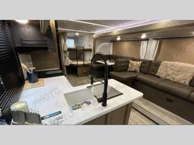 If you're looking for a travel trailer that will meet your family's needs then this one is for you! The kiddos will enjoy a good night's rest on the rear corner double-size bunk beds and you will enjoy a good night's rest on the custom king bed with Versa Tilt inside the front private bedroom. You can also transform the U-shaped dinette and Versa-lounge into extra sleeping spaces. One of the dual entrances leads directly into the rear corner bathroom which has a walk-in shower for you to get squeaky clean each morning. The walk-in pantry is big enough to store your favorite snacks and the oversized refrigerator will keep your beverages nice and cold. There is also an exterior camp kitchen you are sure to love!