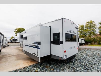 The Salem Hemisphere fifth wheels by Forest River are packed with features, while still being value-minded! Each model is constructed with laminated "Aluma Frame" sidewalls and floor with block foam insulation plus full-length barreled ceilings for added head space. There are LED awning, marker and taillights outside, along with an extra-large pass-thru storage with slam latch baggage doors, plus solar prep and Lippert On-The-Go ladder prep. The 60K on-demand tankless water heater will provide endless hot showers, and the JBL sound system includes a head unit plus interior and exterior speakers to keep the party going. There are also many interior comforts found throughout that will make you feel right at home!