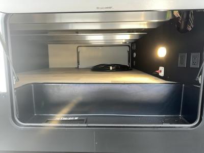 This fifth wheel is packed with convenient features to make your travels more comfortable and enjoyable! The master bedroom includes a king bed slide out with USB ports on either side of the bed so you both can charge your phones, and there is a dresser for your folded clothes. You will love the front bathroom with dual bath sinks, a fiberglass one-piece shower, plus a walk-in closet with shelves and rods to hang clothes! There is a unique middle utility room with washer and dryer prep if you want to add these, a Washer and dryer counter and a rod to hang clothes that will make a perfect laundry room, or you can utilize this space for storage! Head to the main living area to relax on the theater seating or hide-a-bed sofa, and if you have guests stay over, they can sleep here. There is also an entertainment center with a 50" flat screen TV, but you might just leave that off if you're working at the desk with a chair that is provided. We've saved the best part for last, the kitchen! Here, you'll find ample counter space to prep home-cooked meals, a three-burner range with a 24" oven, plus a large counter with barstools where you can enjoy breakfast at each morning. Choosing this fifth wheel is a no-brainer!
