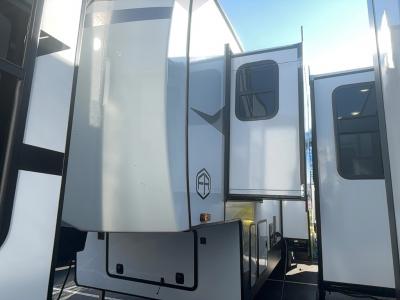 Enjoy a home on wheels with this fifth wheel! There are two bedrooms to choose from plus an upper loft with two 32" x 74" bunk mats, cabinets, and TV prep. The front private bedroom has a queen bed slide across from a dresser and next to a front wardrobe that is prepped to add an optional washer and dryer. The second bedroom has a queen bed slide across from a dresser with wardrobes on either side, plus it's very own full rear bathroom which has a tub and a rear entry/exit door to the unit. The second full bathroom has a one-piece fiberglass shower so everyone can get ready quickly in the morning. Prepare your best home cooked meals with the kitchen island and three burner cooktop then enjoy it at the free-standing dinette. Relax in true comfort each night in the theater seating across from the fireplace and 50" TV at the entertainment center!