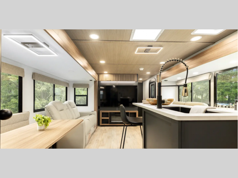 Sleeps 8 Slides 1 Length 39 ft 10 in Ext Width 8 ft Ext Height 11 ft 4 in Hitch Weight 1275 lbs Dry Weight 8708 lbs Cargo Capacity 2767 lbs Fresh Water Capacity 38 gals Grey Water Capacity 96 gals Black Water Capacity 30 gals Number Of Bunks 1 Available Beds Custom King, Versa Queen Refrigerator Type 12V Refrigerator Size 10.7 cu ft Cooktop Burners 3 Number of Awnings 2 Water Heater Type On Demand Tankless AC BTU 31500 btu TV Info LR TV Awning Info 14' and 11'6" w/LED Lights Axle Count 2 Washer/Dryer Available Yes Shower Type Standard Similar Floorplans