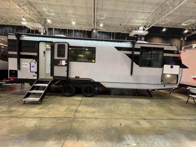 You will love camping every other weekend in this spacious travel trailer. There is a full rear bath with a spacious shower and linen closet for towels and toiletries. Your crew can get comfortable on the theater seating across from the entertainment center, and it even swings open to reveal hidden pantry storage. Easily prepare your meals in the kitchen on the three burner cooktop, or in the oven. There is also a 12V refrigerator, plus a microwave for meals on the go. When you're ready to call it a night, the front private bedroom is sure to provide comfort with its custom king bed, wardrobe, and underbed storage.