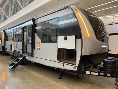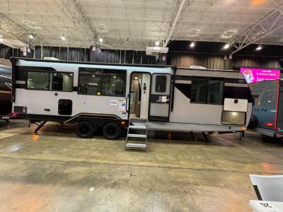 Sleeps 5 Slides 1 Length 34 ft Ext Width 8 ft Ext Height 11 ft 4 in Hitch Weight 875 lbs Dry Weight 6938 lbs Cargo Capacity 2737 lbs Fresh Water Capacity 38 gals Grey Water Capacity 96 gals Black Water Capacity 30 gals Available Beds Custom King Refrigerator Type 12V Refrigerator Size 10.7 cu ft Cooktop Burners 3 Shower Size 36" x 30" Number of Awnings 1 Water Heater Type On Demand Tankless AC BTU 31500 btu TV Info LR TV Awning Info 20' w/LED Lights Axle Count 2 Washer/Dryer Available Yes Shower Type Walk-In Shower Similar Travel Trailer Floorplans