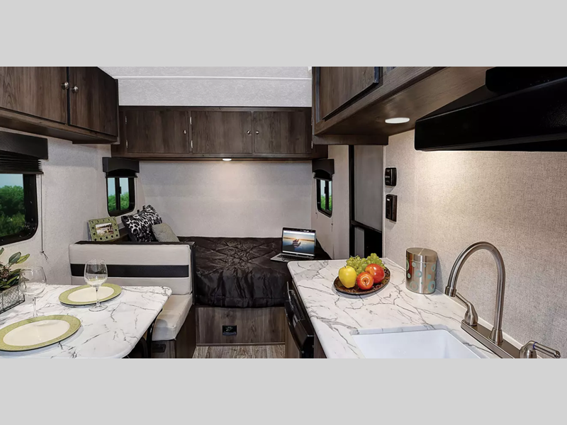 Sleeps 7 Slides 1 Length 23 ft Ext Width 8 ft Ext Height 10 ft Hitch Weight 500 lbs GVWR 4900 lbs Dry Weight 3919 lbs Cargo Capacity 981 lbs Fresh Water Capacity 39 gals Grey Water Capacity 32 gals Black Water Capacity 32 gals Furnace BTU 20000 btu Number Of Bunks 2 Available Beds Murphy Refrigerator Type 12V Refrigerator Size 8 cu ft Cooktop Burners 2 Shower Size 24" x 36" Number of Awnings 1 Water Heater Type Tankless AC BTU 13500 btu Awning Info 10' Power with LED Light Strip & Adj. Legs Axle Count 1 Shower Type Standard Similar Floorplans