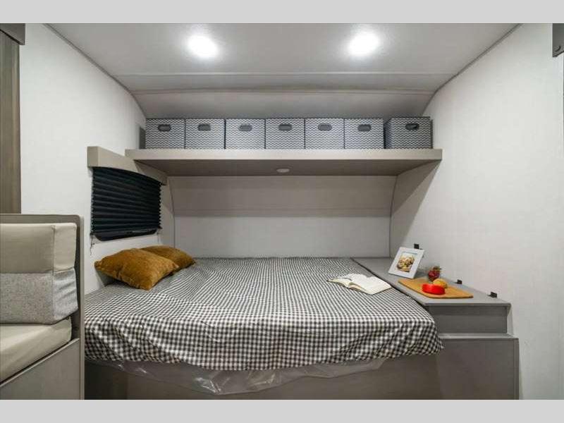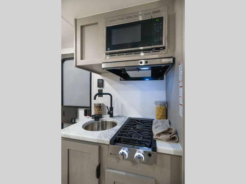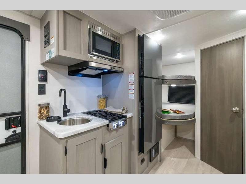 Sleeps 2 Length 20 ft 5 in Ext Width 8 ft Ext Height 10 ft Hitch Weight 355 lbs GVWR 3998 lbs Dry Weight 3199 lbs Cargo Capacity 799 lbs Fresh Water Capacity 40 gals Grey Water Capacity 32 gals Black Water Capacity 32 gals Furnace BTU 20000 btu Available Beds RV Queen Refrigerator Type 12V Refrigerator Size 10 cu ft Cooktop Burners 2 Shower Size 24" x 36" Number of Awnings 1 Water Heater Type On Demand Tankless AC BTU 13500 btu Awning Info 9' Power with LED Light Strip & Adj. Legs Axle Count 1 Shower Type Standard Similar Floorplans