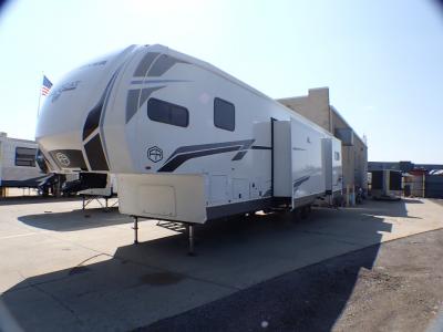 Sleeps 6 Slides 3 Length 42 ft 7 in Ext Width 8 ft Ext Height 13 ft 5 in Hitch Weight 2135 lbs GVWR 14135 lbs Dry Weight 11913 lbs Cargo Capacity 2222 lbs Fresh Water Capacity 60 gals Grey Water Capacity 76 gals Black Water Capacity 76 gals Furnace BTU 35000 btu Number Of Bunks 2 Available Beds King, Queen Refrigerator Type 12V Refrigerator Size 16 cu ft Cooktop Burners 3 Number of Awnings 2 LP Tank Capacity 20 lbs Water Heater Type On Demand Tankless AC BTU 45000 btu TV Info LR 50" TV Awning Info 13´& 12´ Power Axle Count 2 Washer/Dryer Available Yes Number of LP Tanks 2 Shower Type Standard Electrical Service 50 amp Similar Fifth Wheel Floorplans