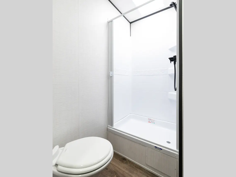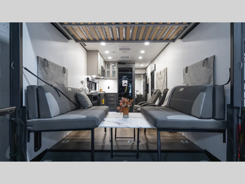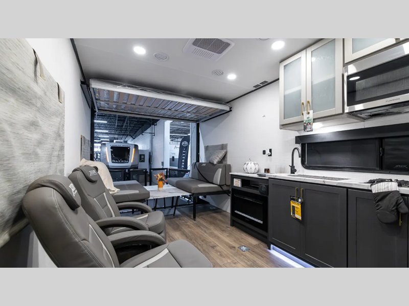 There is a rear beaver tail frame, a docking station, and a magnetic screen wall so you can let the fresh air in without letting the bugs in. You will feel right at home with decorative kitchen backsplash and LED lights, and there is a tankless water heater to provide endless hot showers after trail riding. The Alumifoil insulated enclosed underbelly will help extend your camping season, and the patio railing kit will let you enjoy more time outdoors once the toys are unloaded.