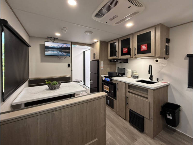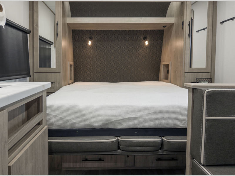 Sleeps 2 Slides 1 Length 17 ft 11 in Ext Width 8 ft Ext Height 10 ft 11 in Exterior Color 454 GVWR 4600 lbs Dry Weight 3826 lbs Fresh Water Capacity 37 gals Grey Water Capacity 45 gals Black Water Capacity 37 gals Tire Size ST225/75R15LRE Furnace BTU 20000 btu Available Beds Murphy Bed Refrigerator Type 12V Refrigerator Size 6.2 cu ft Convection Cooking Yes Cooktop Burners 2 Number of Awnings 1 LP Tank Capacity 20 lbs Water Heater Type On Demand Tankless AC BTU 13500 btu TV Info LR High Def TV Awning Info 12' Adjustable Power with LED Lighting Axle Count 1 Number of LP Tanks 2 Shower Type Walk-In Shower Electrical Service 30 amp Similar Floorplans