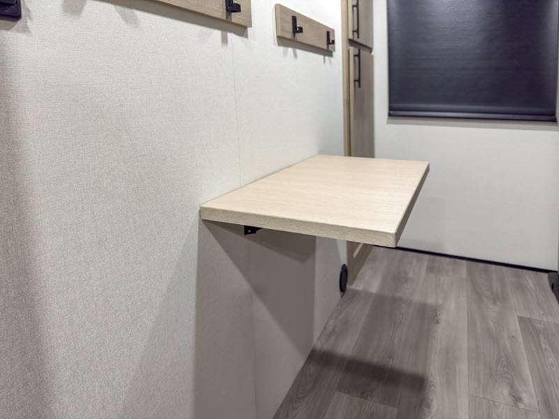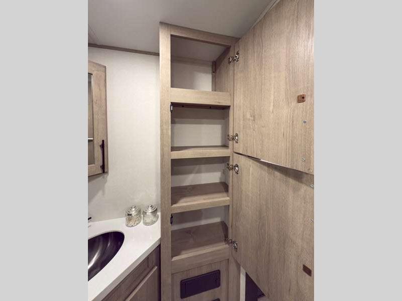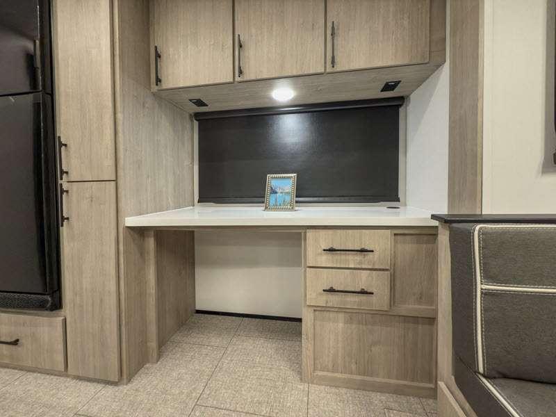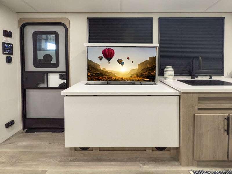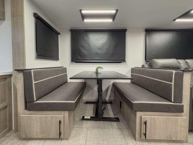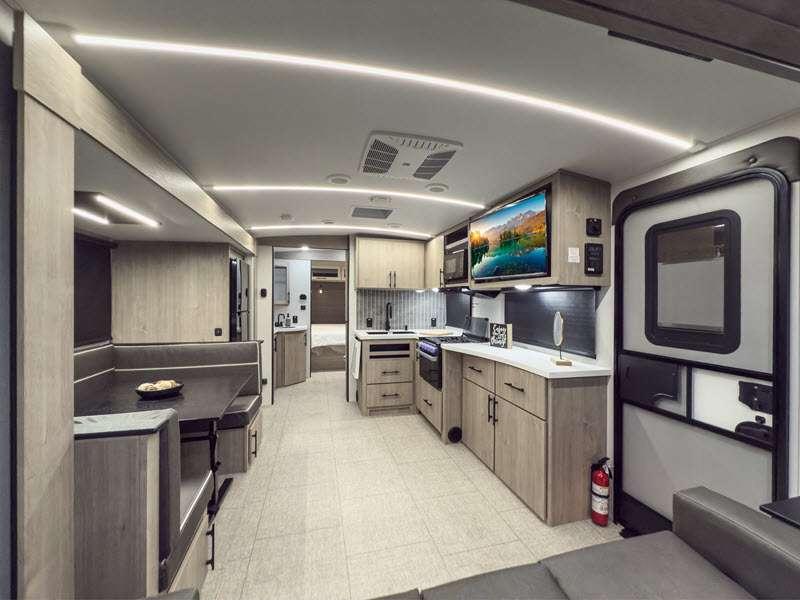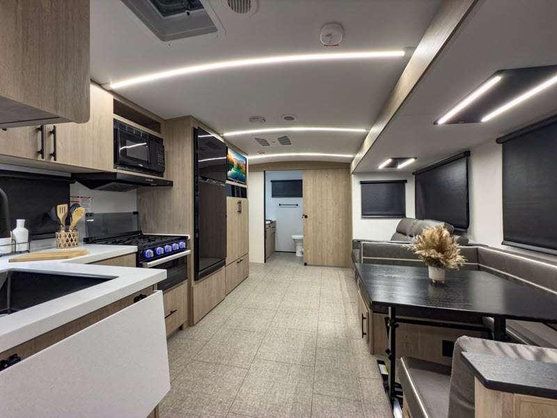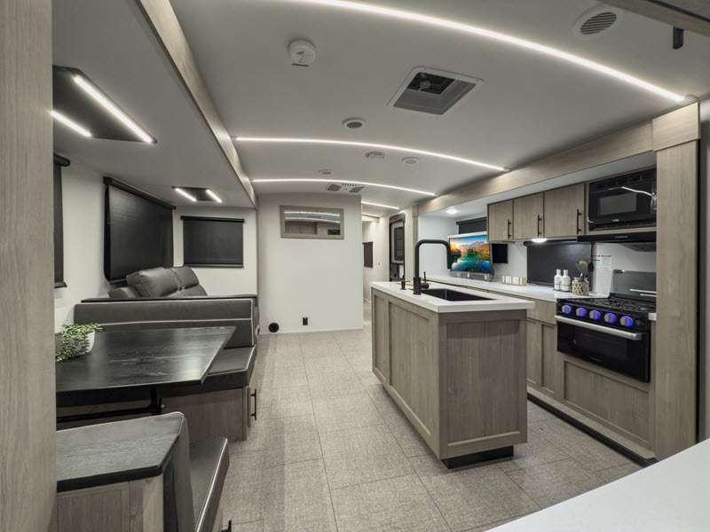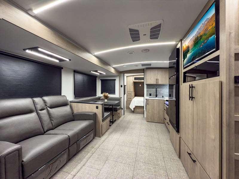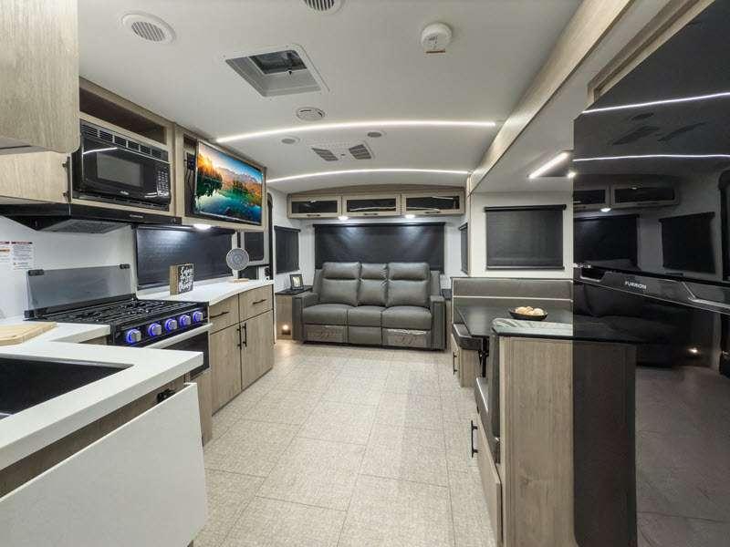 Each of these includes exceptional features, like a 200W roof-mounted solar panel, high-capacity furnace, residential cabinetry, spare tire & carrier, and a universal docking station. Additionally, you'll have accommodating features scattered all throughout the trailer with the upgraded residential furniture in the interior, the solid surface countertops in the kitchen, motion sensor entry LED lighting, and the large panoramic windows in the interior. The aluminum framed fully laminated sidewalls and enclosed underbelly with suspended tanks will hold them up for your adventures on the road!