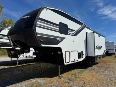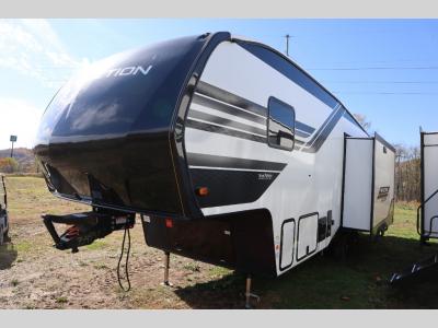 Get ready to enjoy everything the campgrounds and surrounding area has to offer when you are setup to camp in this fifth wheel! The two electric awnings offer protected areas creating outdoor living spaces; just grab your camping chairs from the unobstructed pass-through storage. And the interior offers a spacious living area and kitchen combination with dual opposing slides for maximum space. You can sit on the tri-fold sofa or the dinette to lounge back and rest after a day of adventure. The hutch and kitchen island offer counter space to prepare and serve meals, and there is a large pantry for goodies. The 40" LED HDTV with a fireplace below provides entertainment before bedtime or on a rainy day. And the front bedroom offers privacy, a walk-around queen bed, and plenty of storage!