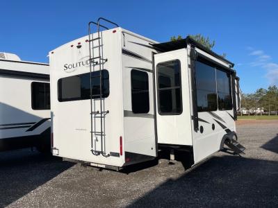 Each Solitude fifth wheel by Grand Design features a 101" wide-body construction, heavy duty 8,000 lb. axles, frameless tinted windows, and high-gloss gel coat sidewalls. You can camp year around thanks to the Weather-Tek Package that includes a 35K BTU high-capacity furnace, an all-in-one enclosed and heated utility center, and a fully enclosed underbelly with heated tanks and storage. Inside, you'll love the premium roller shades, hardwood cabinet doors, solid surface countertops, plus residential finishes throughout to make you truly feel at home. Each model also includes a MORryde CRE3000 suspension system, self adjusting brakes, and a MORryde pin box that will provide smooth towing from home to campground. Affordable luxury is possible with the Solitude fifth wheels; choose yours today!