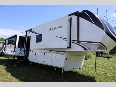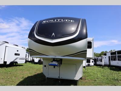 Each Solitude fifth wheel by Grand Design features a 101" wide-body construction, heavy duty 8,000 lb. axles, frameless tinted windows, and high-gloss gel coat sidewalls. You can camp year around thanks to the Weather-Tek Package that includes a 35K BTU high-capacity furnace, an all-in-one enclosed and heated utility center, and a fully enclosed underbelly with heated tanks and storage. Inside, you'll love the premium roller shades, hardwood cabinet doors, solid surface countertops, plus residential finishes throughout to make you truly feel at home. Each model also includes a MORryde CRE3000 suspension system, self adjusting brakes, and a MORryde pin box that will provide smooth towing from home to campground. Affordable luxury is possible with the Solitude fifth wheels; choose yours today!