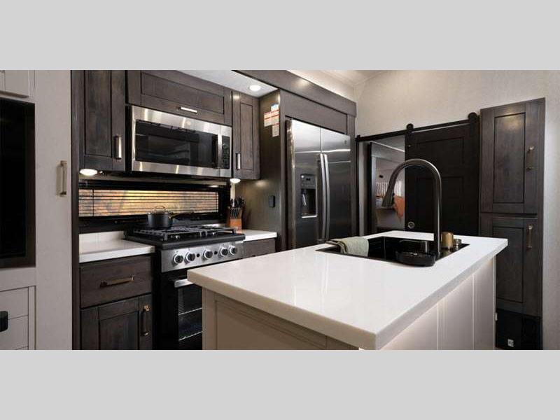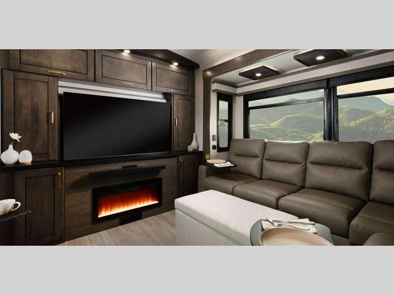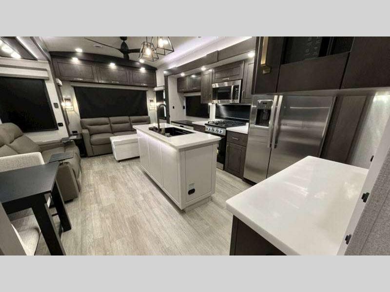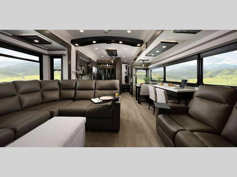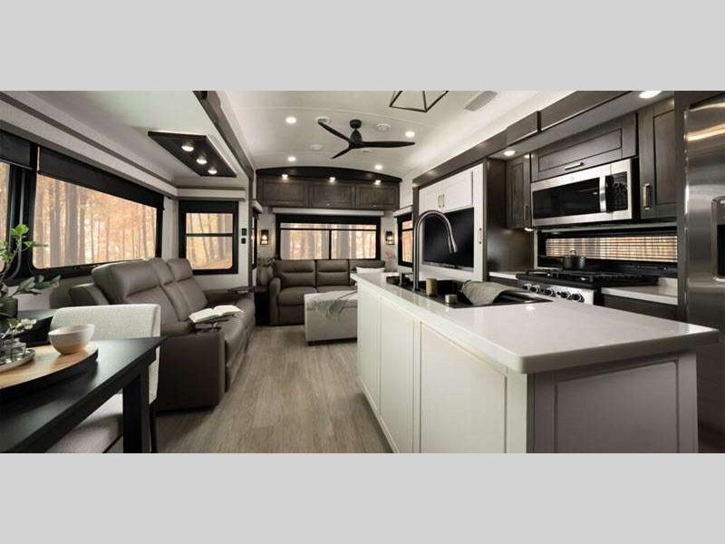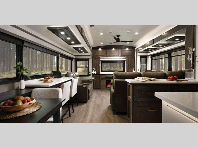 Sleeps 4 Slides 5 Length 43 ft 11 in Ext Width 8 ft 6 in Ext Height 13 ft 3 in Int Height 8 ft 6 in Interior Color Stonewall Gray Exterior Color Opt. Full Body Paint (Ash, Shadow, Glacier Blue) Hitch Weight 3090 lbs GVWR 17995 lbs Dry Weight 15645 lbs Cargo Capacity 2350 lbs Fresh Water Capacity 75 gals Grey Water Capacity 74 gals Black Water Capacity 74 gals Tire Size 215/75R17.5H Furnace BTU 40000 btu Available Beds King Refrigerator Type Residential Refrigerator Size 21 cu ft Convection Cooking Yes Cooktop Burners 4 Shower Size 36" x 48" Number of Awnings 2 Axle Weight 8000 lbs LP Tank Capacity 90 Lbs. Water Heater Type On Demand Tankless AC BTU 30000 btu TV Info LR 4K Smart LED HDTV, BR 32" 4K Smart TV Awning Info 14' & 14' Electric w/ Integrated RGB LED Lights Axle Count 2 Washer/Dryer Available Yes Shower Type Shower w/Seat Solar Wattage 400 watts Similar Floorplans