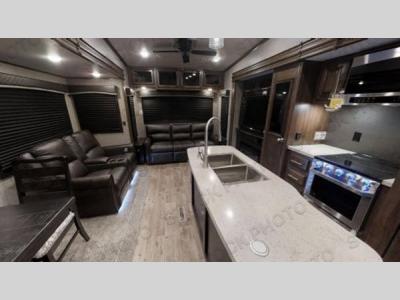 Sleeps 8 Slides 4 Length 42 ft 1 in Ext Width 8 ft 1 in Ext Height 13 ft 4 in Int Height 8 ft 7 in Interior Color Calli Linen Hitch Weight 2580 lbs GVWR 15400 lbs Dry Weight 13115 lbs Cargo Capacity 2285 lbs Fresh Water Capacity 81 gals Grey Water Capacity 87 gals Black Water Capacity 50 gals Tire Size ST235/80R16H Furnace BTU 35000 btu Available Beds King Refrigerator Type 12V Refrigerator Size 16 cu ft Cooktop Burners 3 Shower Size 30" x 48" Number of Awnings 2 LP Tank Capacity 30 lbs Water Heater Type Tankless AC BTU 30000 btu TV Info LR 4K Ultra HD Smart TV Awning Info 10' 6" and 21' Electric with dimmable LED lights Axle Count 2 Washer/Dryer Available Yes Number of LP Tanks 2 Shower Type Standard Electrical Service 50 amp Solar Wattage 200 watts Similar Fifth Wheel Floorplans