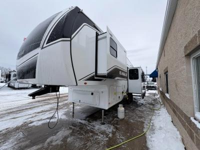 Sleeps 4 Slides 3 Length 32 ft 11 in Ext Width 8 ft 1 in Ext Height 12 ft 6 in Int Height 8 ft 5 in Interior Color Calli Linen Hitch Weight 1960 lbs GVWR 11350 lbs Dry Weight 9515 lbs Cargo Capacity 1835 lbs Fresh Water Capacity 52 gals Grey Water Capacity 82 gals Black Water Capacity 45 gals Tire Size ST225/75R15E Furnace BTU 35000 btu Available Beds Olympic Queen Refrigerator Type GE 12V Refrigerator Size 10 cu ft Cooktop Burners 3 Shower Size 34" x 34" Number of Awnings 1 LP Tank Capacity 30 lbs Water Heater Type On Demand AC BTU 15000 btu TV Info LR 4K Ultra LED HD Smart TV Awning Info 15' Electric w/Integrated LED Lights Axle Count 2 Number of LP Tanks 2 Shower Type Radius Electrical Service 50 amp Similar Fifth Wheel Floorplans