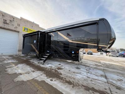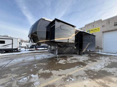 Sleeps 4 Slides 3 Length 36 ft Ext Width 8 ft 6 in Ext Height 13 ft 4 in Int Height 8 ft 6 in Exterior Color Midnight Charcoal, Midnight Gold, Silver Metallic Hitch Weight 2510 lbs GVWR 16600 lbs Dry Weight 13545 lbs Cargo Capacity 3055 lbs Fresh Water Capacity 75 gals Grey Water Capacity 87 gals Black Water Capacity 50 gals Tire Size 215/75R17.5"H Furnace BTU 40000 btu Available Beds King Refrigerator Type Residential Refrigerator Size 21 cu ft Convection Cooking Yes Cooktop Burners 4 Number of Awnings 2 LP Tank Capacity 40 Water Heater Type On Demand Tankless AC BTU 30000 btu TV Info LR 4K Smart LED HDTV, BR 32" 4K Smart LED TV, EXT 40" 4K Smart LED TV Awning Info 10' and 16' Electric with multi-color LED Lights Axle Count 2 Washer/Dryer Available Yes Number of LP Tanks 3 Shower Type Walk-In Shower Electrical Service 50 amp Solar Wattage 400 watts Similar Fifth Wheel Floorplans