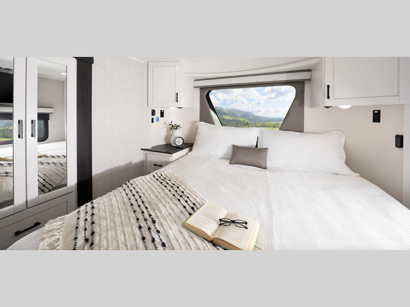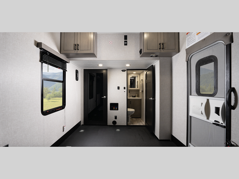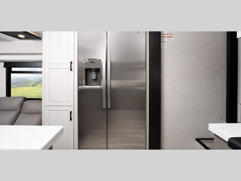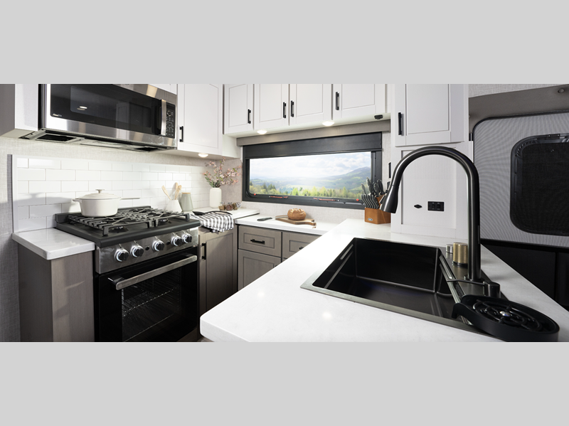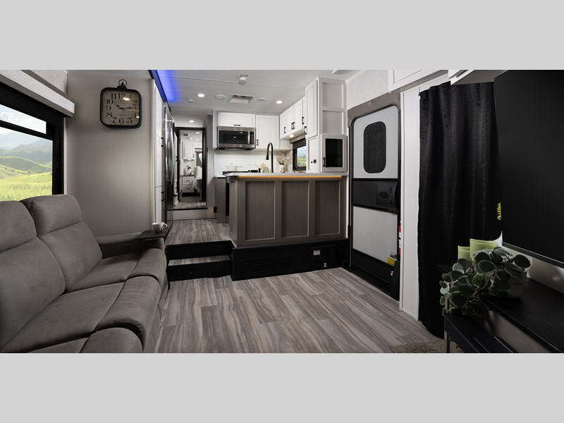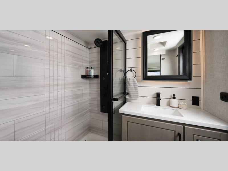The mandatory 5 Star Handling Equipment will make towing easier than ever with a MORryde CRE-3000 rubberized suspension, Dexter axles with ABS and Tow Assist, plus 'H' rated Uniroyal tires. A Magnum Truss Roof System, which is the strongest tested roof in the industry will prolong the life of your RV, and the Climate Shield zero-degree tested weather protection means you can camp all year long. Inside, GE appliances, residential vinyl flooring, and handcrafted doors, drawers, and trim will have you feeling right at home.