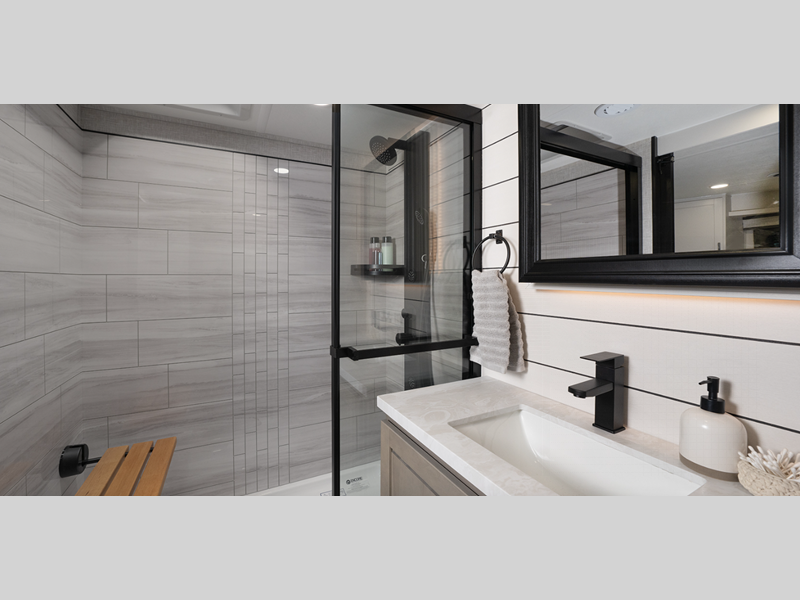 - Residential “walk-in” shower with shampoo/soap holder, teak seat and shower tower