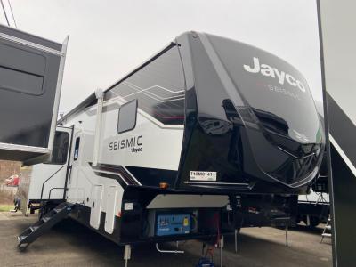 One look at the Seismic toy hauler fifth wheels by Jayco, and you'll never go back! Each model features a custom automotive-grade vinyl exterior graphics package, a painted fiberglass front cap with built-in LED lighting, and 102" wide-body structural steel I-beam construction. You'll find the pass-through storage with Slam-Latch baggage doors will make unpacking easier than ever, and the rear ramp door/patio with anti-slip, non-skid flooring will allow you to unload your toys with no trouble at all. These toy haulers feature a three-season garage wall/doors, a 30-gallon fuel tank with a timer, and exterior marine-grade speakers to keep the party going. The Climate Shield zero degree tested weather protection includes a 35,000 BTU furnace and a fully enclosed and heated underbelly for better protection against the elements. And we haven't even touched on the interior luxuries you'll find, like solid hardwood cabinet doors, residential vinyl flooring made in the USA, night roller shades, and more!