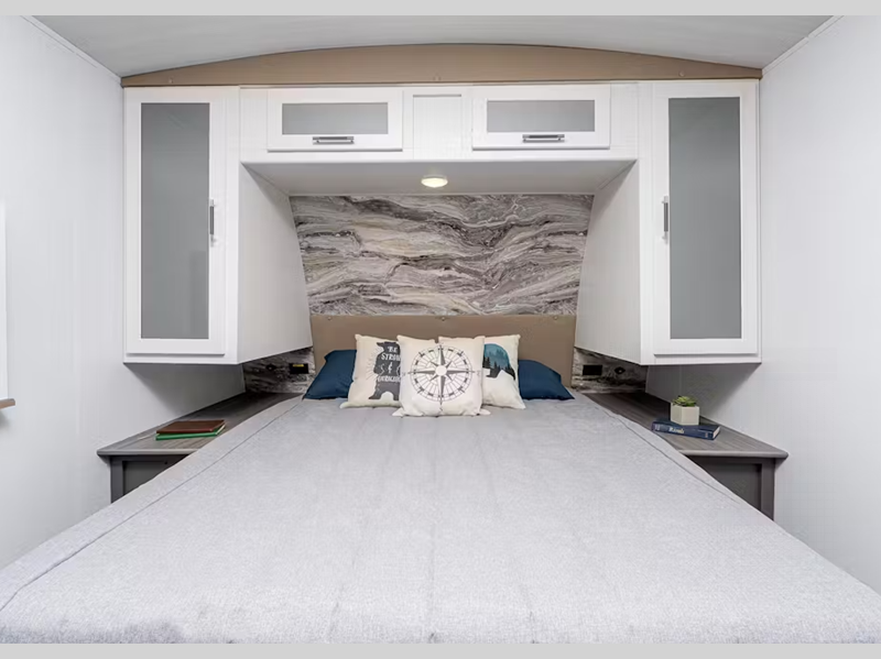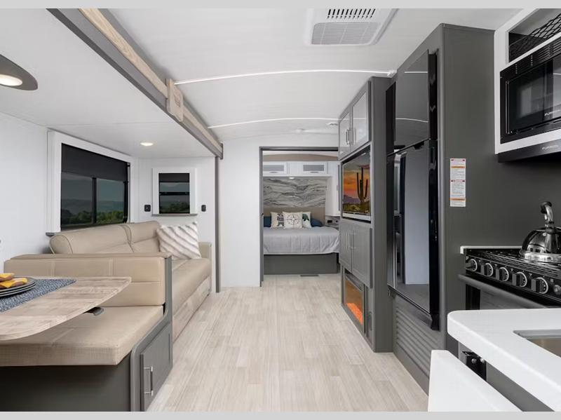 Sleeps 4 Slides 1 Length 31 ft 11 in Ext Height 11 ft 3 in Interior Color Tranquil Timber Hitch Weight 795 lbs Dry Weight 6926 lbs Cargo Capacity 1874 lbs Fresh Water Capacity 54 gals Grey Water Capacity 76 gals Black Water Capacity 38 gals Tire Size ST225/75R15E Furnace BTU 30000 btu Available Beds Queen Refrigerator Type 12V Double Door Refrigerator Size 10 cu ft Convection Cooking Yes Cooktop Burners 3 Number of Awnings 1 LP Tank Capacity 20 lbs Water Heater Type Girard Tankless AC BTU 13500 btu TV Info LR 12V Smart TV, Ext. TV Awning Info 19' Axle Count 2 Number of LP Tanks 2 Shower Type Standard Similar Floorplans