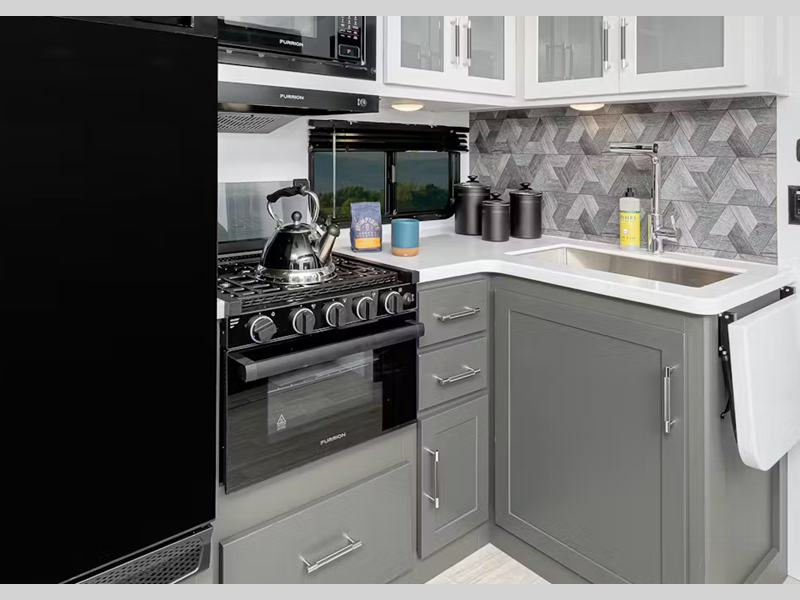 Sleeps 5 Slides 1 Length 28 ft 8 in Ext Height 11 ft 1 in Interior Color Tranquil Timber Hitch Weight 735 lbs Dry Weight 5970 lbs Cargo Capacity 1630 lbs Fresh Water Capacity 54 gals Grey Water Capacity 76 gals Black Water Capacity 38 gals Tire Size ST205/75R14D Furnace BTU 30000 btu Available Beds Queen Refrigerator Type 12V Double Door Refrigerator Size 10 cu ft Convection Cooking Yes Cooktop Burners 3 Number of Awnings 1 LP Tank Capacity 20 lbs Water Heater Type Girard Tankless AC BTU 13500 btu TV Info 12V Smart TV Awning Info 19' Axle Count 2 Number of LP Tanks 2 Shower Type Standard Similar Floorplans