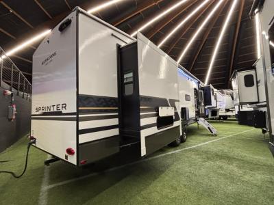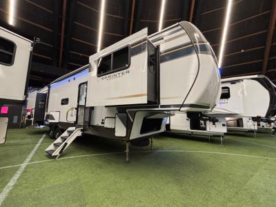 The Sprinter fifth wheels by Keystone feature spacious living areas, plenty of storage, and outstanding towability. Each unit is constructed with 2" aluminum framed and laminated sidewalls, a fully walkable roof, and dual layer insulation to help extend your camping season. The heated pass-through storage includes lockable slam latch baggage doors so you can easily pack your gear, and the one-touch 4-point leveling system features return hookup memory to have you set up in no-time. Head inside to find Congoleum vinyl flooring, Thomas Payne luxury collection furniture, residential style seamless marbled countertops, and an upgraded bedspread to name a few comforts. The Sprinter also includes a Girard tankless on-demand water heater, a central command center, plus a 30k BTU furnace and two A/C units to ensure your comfort!