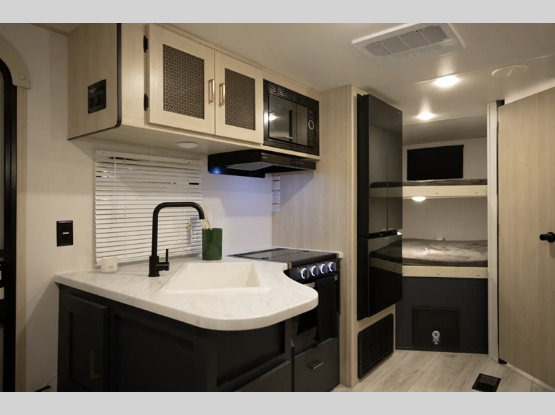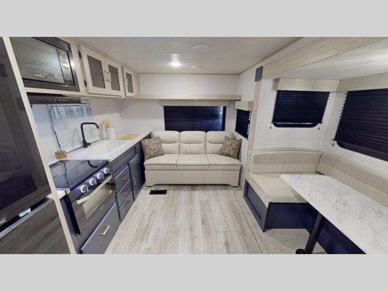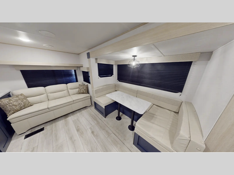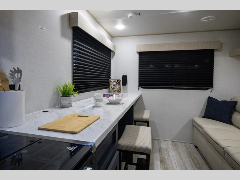 Each model also includes four stabilizer jacks outside, along with an enclosed and heated underbelly, an LED-lit adjustable power awning, and steel fold-out entry steps for a secure entrance into your trailer. Inside, you'll enjoy seamless Carefree Congoleum flooring, Thermofoil pressed countertops, pleated nightshades throughout, and many more comforts!
