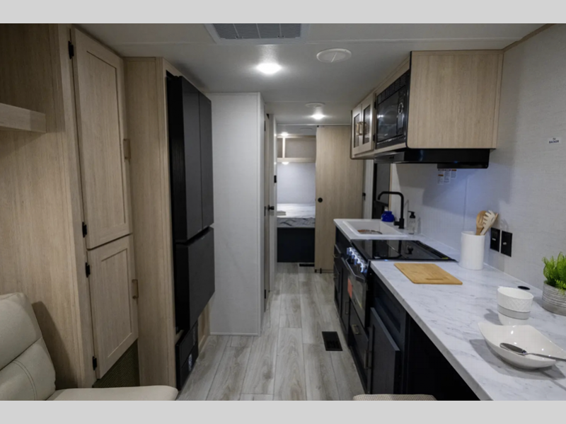 Sleeps 8 Slides 1 Length 28 ft 5 in Ext Width 8 ft Ext Height 10 ft 8 in Hitch Weight 724 lbs Dry Weight 5540 lbs Cargo Capacity 2184 lbs Fresh Water Capacity 42 gals Grey Water Capacity 34 gals Black Water Capacity 34 gals Number Of Bunks 2 Available Beds Queen Refrigerator Type French Door w/ Bottom Freezer Cooktop Burners 3 Number of Awnings 1 LP Tank Capacity 20 lbs Water Heater Type On Demand Tankless AC BTU 15000 btu Awning Info 13' LED Lit Power Axle Count 2 Number of LP Tanks 2 Shower Type Standard Electrical Service 30 amp Similar Floorplans