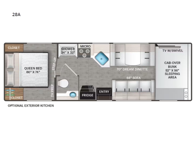 Step up your traveling game with this motorhome! No need to stay at a hotel or eat fast food when you have a rear private bedroom with a 60" x 74" queen bed to lay your head on at night and a three burner cooktop to prepare delicious home cooked meals. The split-style bathroom makes it easy for one person to clean up in the 24" x 32" shower while another uses the private toilet and sink. Enjoy meals, play games, and even transform the 70" Dream Dinette into an extra sleeping space. You have even more sleeping space on the 52" x 96" bunk over cab with a 39" TV on a swivel to watch a movie while relaxing on the 68" sofa. You can even add an optional exterior kitchen for more convenience!