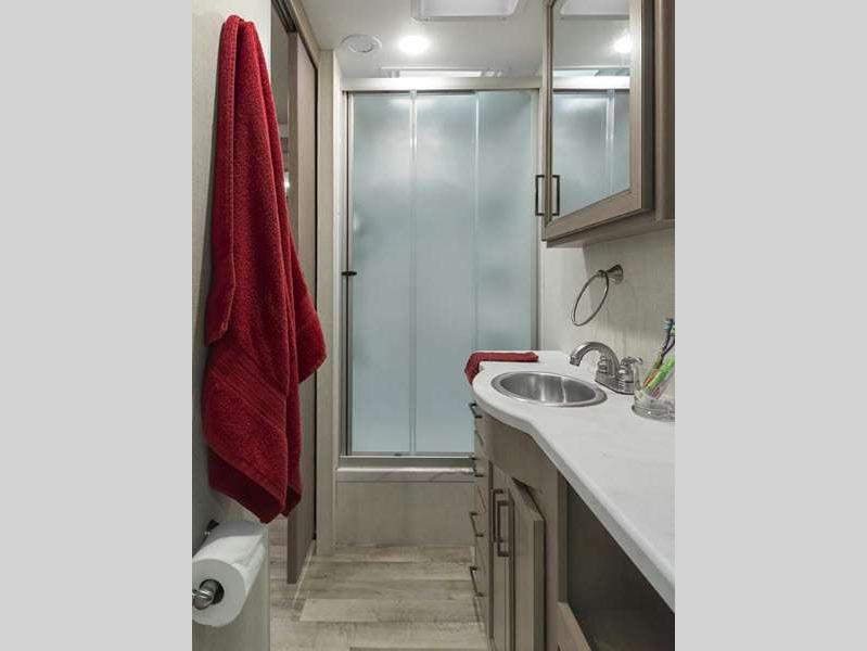 Sleeps 5 Slides 1 Length 30 ft 11 in Ext Width 8 ft 3 in Ext Height 12 ft 2 in Int Height 7 ft Interior Color Hilton Head, Nantucket Blue II Exterior Color Partial Paint; Granite Peak, Silverstone, Full Body Paint; Great Falls, Morning Rain Hitch Weight 8000 lbs GVWR 18000 lbs Fresh Water Capacity 50 gals Grey Water Capacity 40 gals Black Water Capacity 40 gals Tire Size 19.5" Furnace BTU 35000 btu Generator Onan RV QG 4000 Gas Fuel Type Gasoline Engine 7.3L V8 Chassis Ford F-53 Horsepower 335 hp Fuel Capacity 80 gals Wheelbase 190 in Number Of Bunks 1 Available Beds King Torque 468 ft-lb Refrigerator Type Residential Double Door Stainless Cooktop Burners 3 Shower Size 24" x 36" Number of Awnings 1 LP Tank Capacity 88 lbs Water Heater Type Tankless Basement Storage 69 cu. ft. TV Info LR 40" LED Smart TV, BR 32" Smart LED TV, Ext. 32" on Swivel w/ Bluetooth Awning Info 19' Power Patio with Integrated LED Lighting Gross Combined Weight 23000 lbs Shower Type Standard Electrical Service 50 amp Solar Wattage 100 watts Similar Floorplans