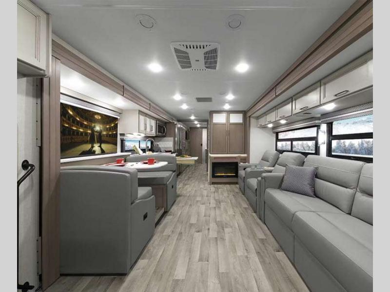 Sleeps 5 Slides 2 Length 36 ft 11 in Ext Width 8 ft 3 in Ext Height 12 ft 4 in Int Height 7 ft Interior Color Hilton Head, Nantucket Blue II Exterior Color Partial Paint; Granite Peak, Silverstone, Full Body Paint; Great Falls, Morning Rain Hitch Weight 8000 lbs GVWR 22000 lbs Fresh Water Capacity 50 gals Tire Size 22.5" Furnace BTU 35000 btu Generator Onan RV QG 5500 Gas Fuel Type Gasoline Engine 7.3L V8 Chassis Ford F-53 Horsepower 335 hp Fuel Capacity 80 gals Wheelbase 242 in Number Of Bunks 1 Available Beds King Torque 468 ft-lb Refrigerator Type Side by Side Cooktop Burners 3 Shower Size 30" x 36" Number of Awnings 1 LP Tank Capacity 88 lbs Water Heater Type Tankless Basement Storage 117 cu. ft. TV Info LR 40" LED Smart TV, BR 32" Smart LED TV, Ext. 32" on Swivel w/ Bluetooth Awning Info 17' Patio Power w/Integrated LED Lighting Washer/Dryer Available Yes Gross Combined Weight 26000 lbs Shower Type Standard Electrical Service 50 amp Solar Wattage 100 watts Similar Floorplans